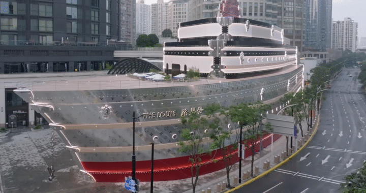6月25日,路易威登(LV)在上海开了一个新店,名字叫“路易号”。它看起来像一艘红色和银色的大船,停在南京西路的商场旁边。船上有LV的花纹和锁,船顶是很多大行李箱。很多人路过这里都会拍照。