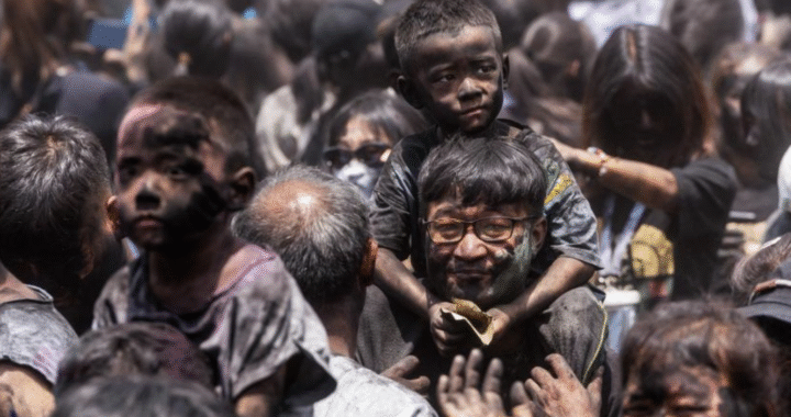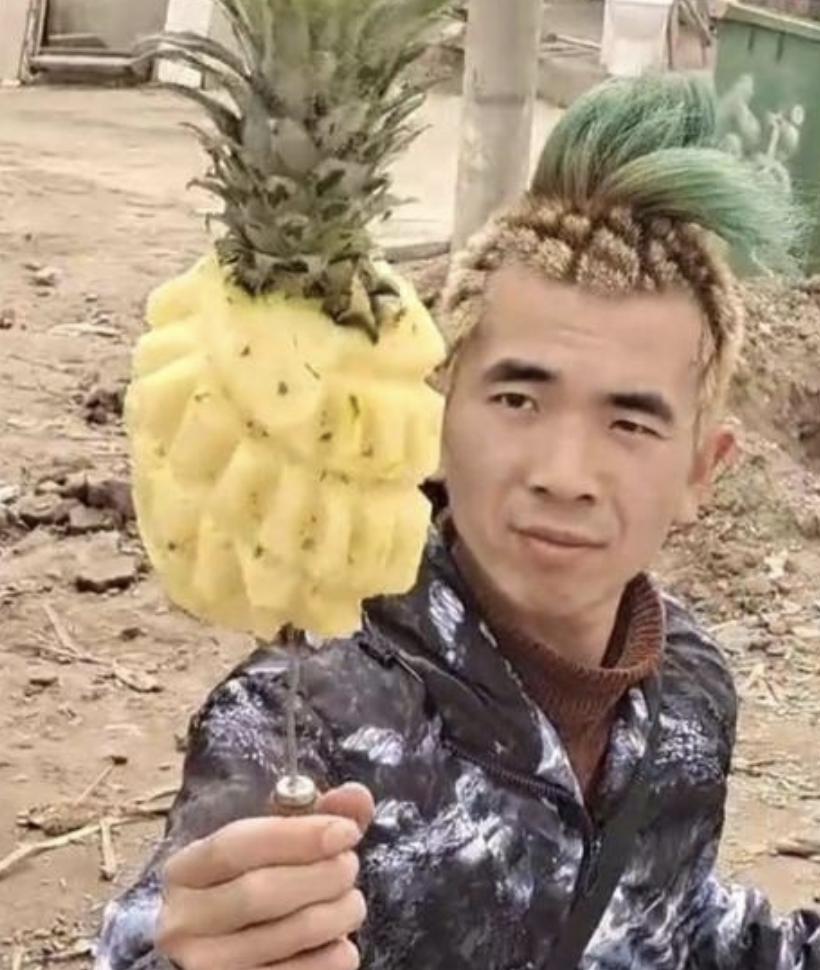 The sun shone on his head, and from a distance, he looked like a walking pineapple. Passersby all looked at him, some taking photos with their phones, others laughing.
