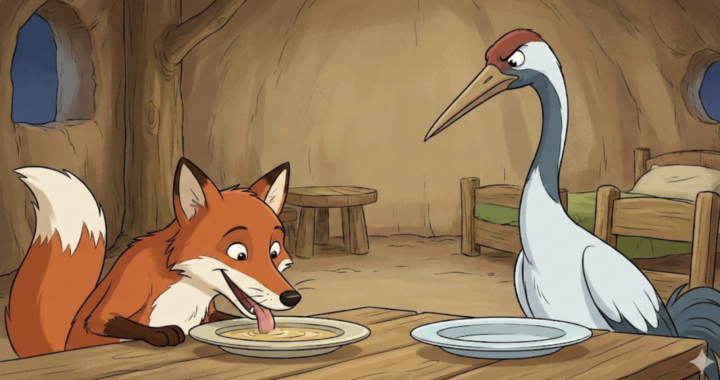 这天,狐狸请仙鹤吃饭,可他却很小气,端出一只平底的小盘子,盘子里盛了一点儿肉汤,他还一直说:“仙鹤大姐,别客气,请吃吧,吃吧?”仙鹤一看,非常生气,因为她的嘴巴又尖又长,盘子里的肉汤一点也没喝到,可狐狸呢,张开他那又阔又大的嘴巴。呼噜呼噜没几下,就把汤喝光了,还假惺惺地问仙鹤:“您吃饱了吧?我烧的汤,不知合不合您口味?” 仙鹤对狐狸笑笑说:“谢谢您的午餐,明天请到我们家吃饭吧?”狐狸正等着仙鹤的这句话呢,马上说:“好的,明天中午我一定去,一定去。”狐狸一心想在仙鹤家多吃点儿,这天晚饭没吃,第二天早饭也没吃,饿着肚子,早早来到仙鹤家等着吃午饭了。狐狸一进仙鹤家的门就闻到一股香味儿。他仔细闻了闻:“嗯,一定是在烧鲜鱼?”狐狸心里高兴极了。 狐狸坐到饭桌前,不一会儿,仙鹤端出一只长颈瓶子放到狐狸面前,指着瓶子里的鱼和鲜汤说:“狐狸先生,请吃吧,别客气?”狐狸望着那么一点大的瓶口,他那阔嘴巴怎么也伸不进去。闻着香味,肚子饿得咕咕叫,馋得直流口水。狐狸什么也吃不到,只能看着仙鹤把又尖又长的嘴巴伸进瓶子里,把鱼吃了,汤喝光,还客气地劝狐狸:“吃吧,放开吃吧?”