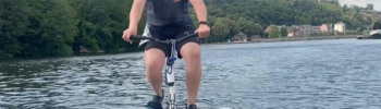 有的人认为这比在地上骑自行车难多了,在水上骑自行车真的很不容易。Yǒu de rén rènwéi zhè bǐ zài dìshàng qí zìxíngchē nán duō le, zài shuǐshàng qí zìxíngchē zhēnde hěn bù róngyì. Some people think it’s much harder than cycling on land. Riding a bike on the water is really not easy.